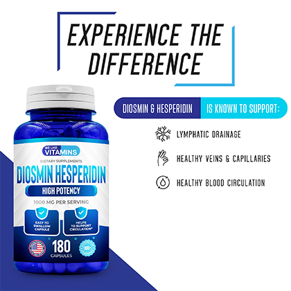 Experience the benefits of improved lymphatic flow, reducing discomfort, swelling, and fluid retention. Our 1000mg Diosmin Hesperidin capsules support a healthy balance of fluids in your body, contributing to overall well-being.