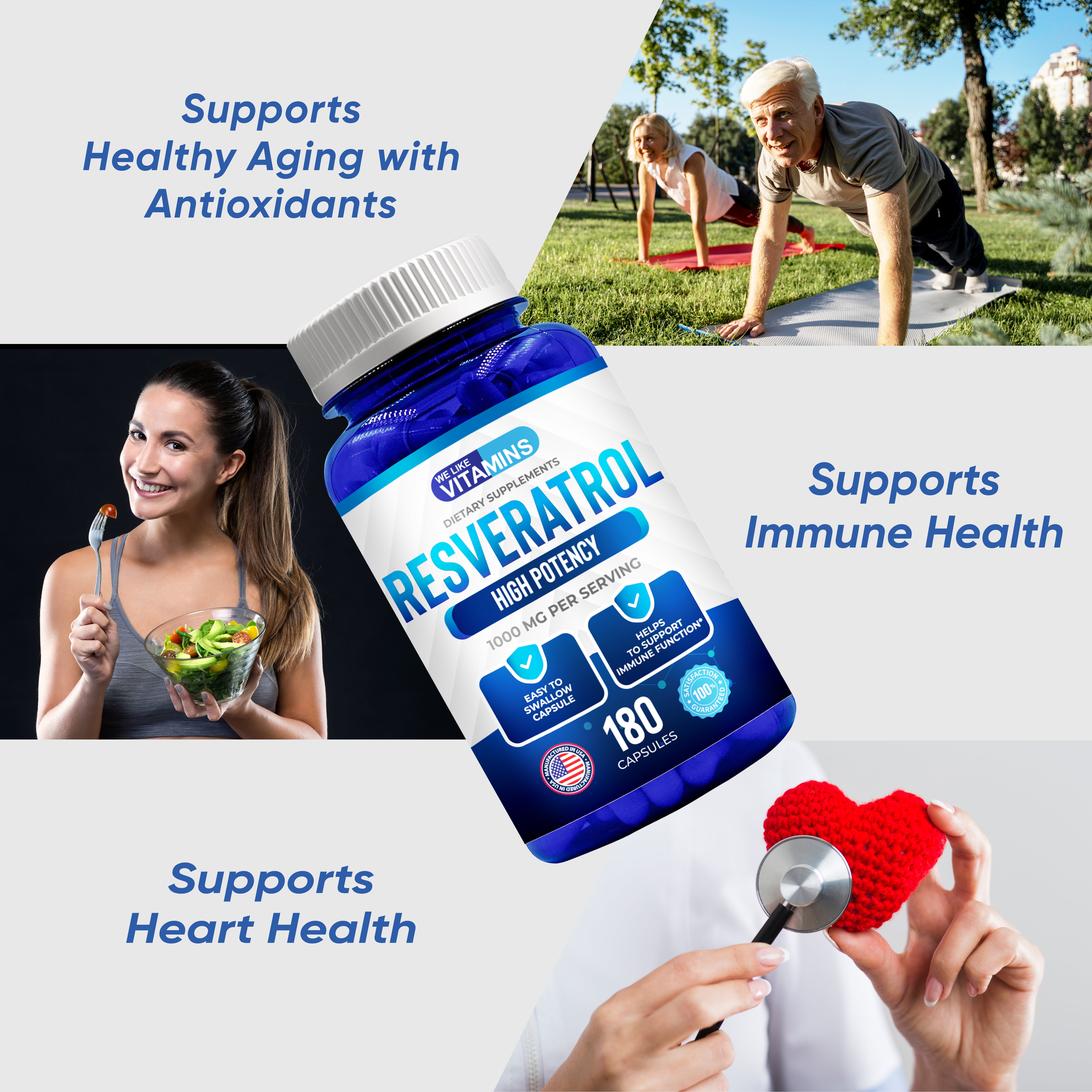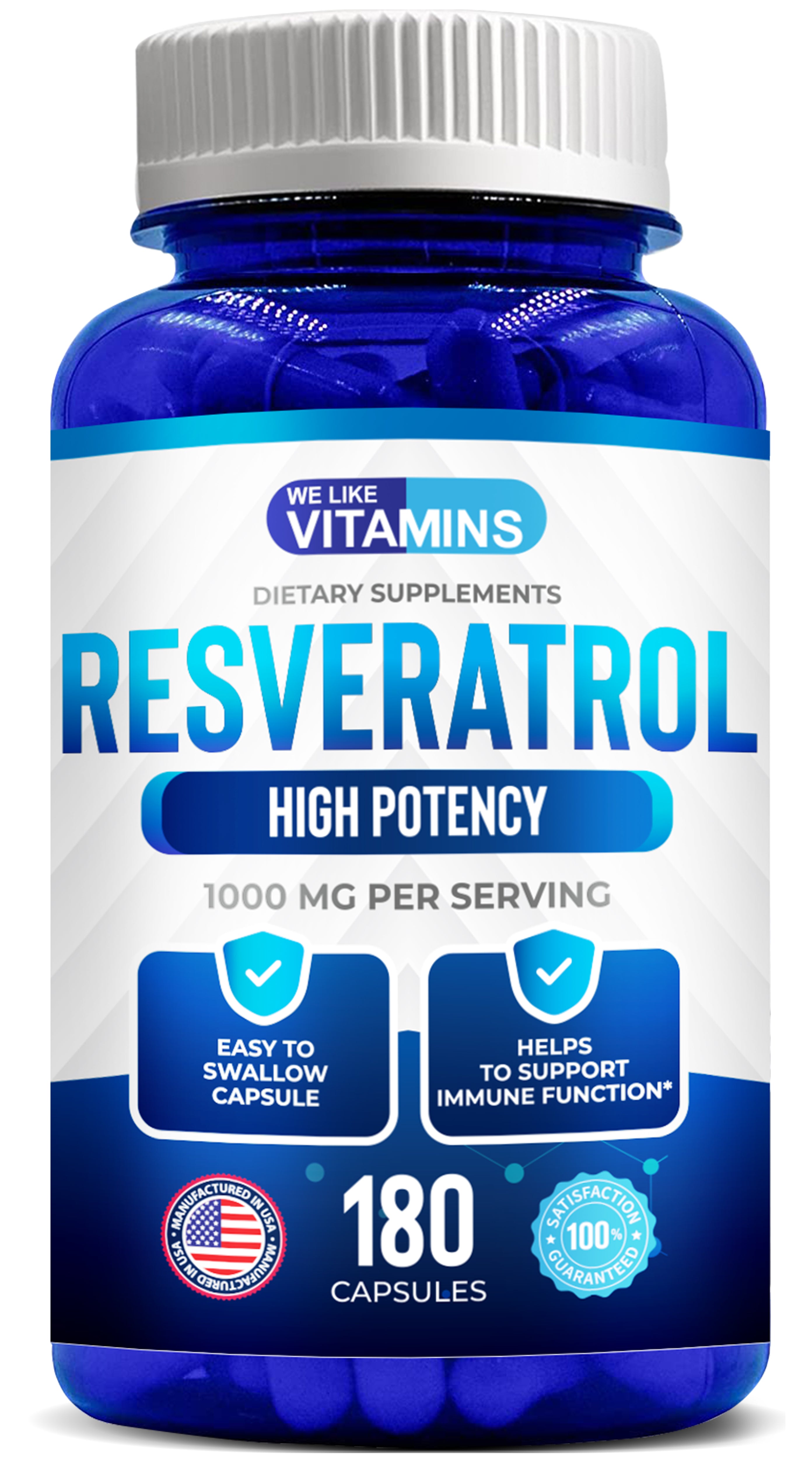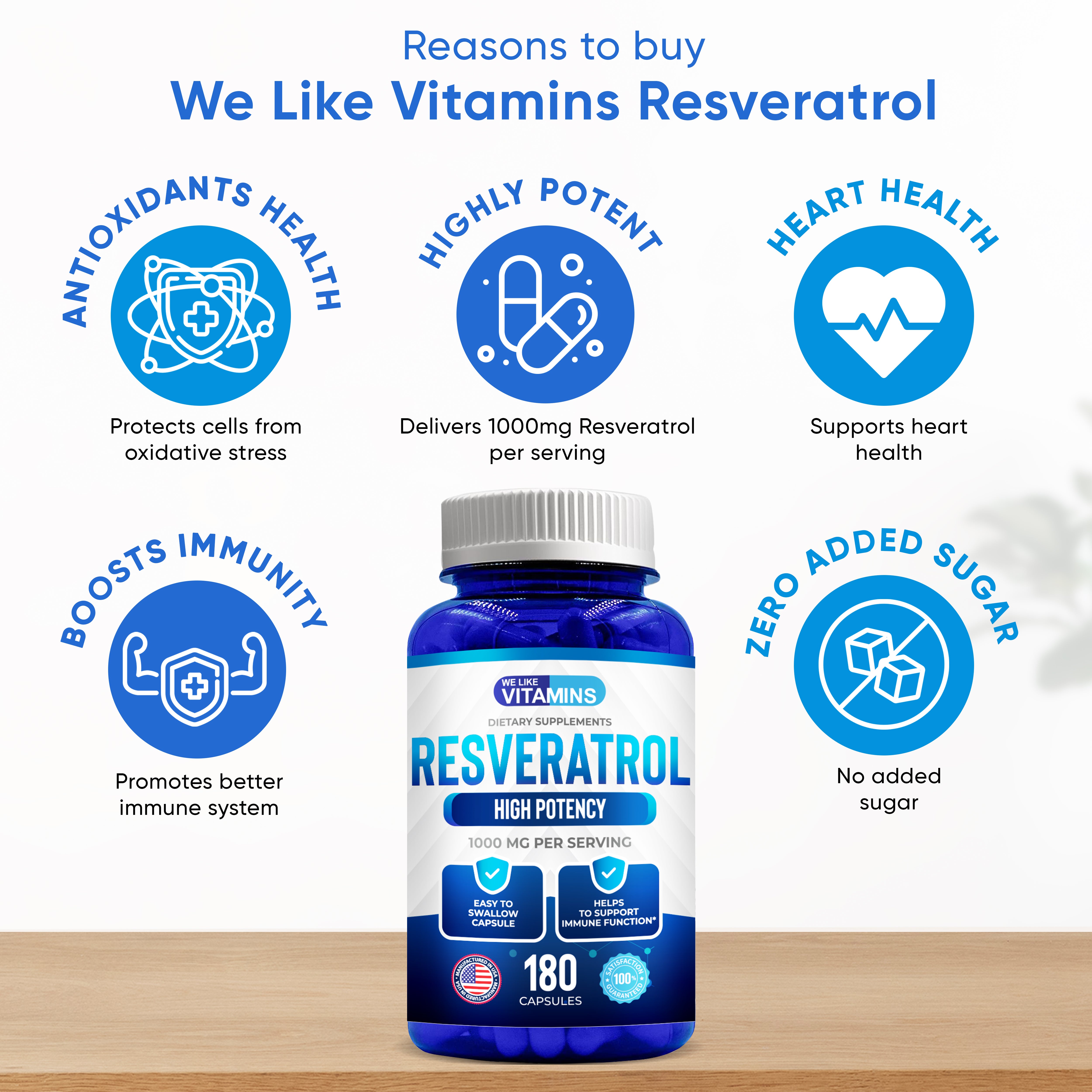 We Like Vitamins Resveratrol 1000mg provides potent antioxidant benefits to support overall health and well-being. Resveratrol, a natural compound found in red wine and certain plants, helps combat free radicals, reducing oxidative stress and promoting cellular health.
